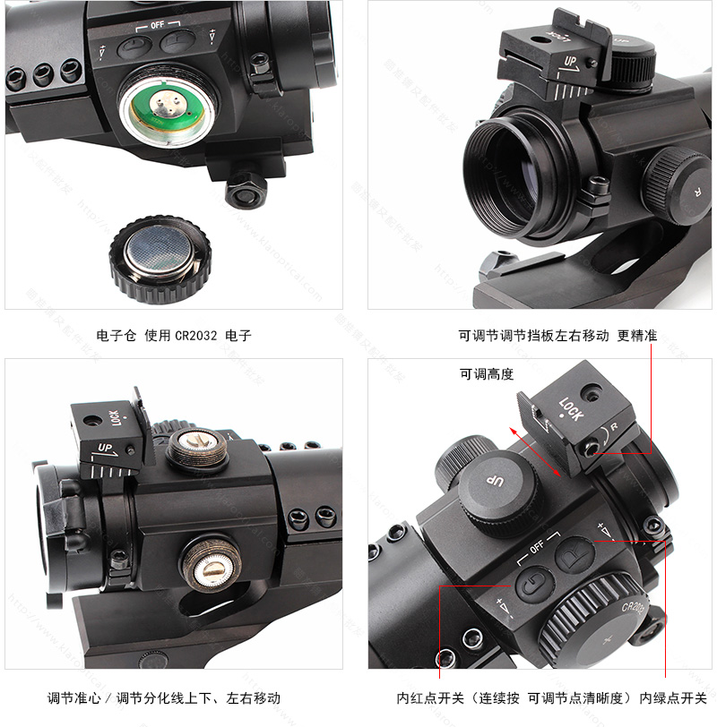 6. 可調(diào)范圍。您可以調(diào)整擋板向左或向右移動(dòng),調(diào)整擋板高度,調(diào)整瞄準(zhǔn)點(diǎn)/分野線,上下左右移動(dòng)。同時(shí),長(zhǎng)時(shí)間按下紅綠點(diǎn)開關(guān)可調(diào)節(jié)其銳度。調(diào)整它們給你帶來(lái)舒適的感覺(jué)